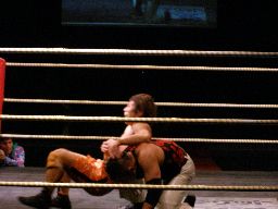 高梨ダドリードッグ狙うがベルナルドはアトミックドロップに切り返す。ベルナルドロープに振ってイタリアンストレッチ(右写真)。