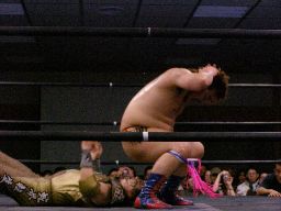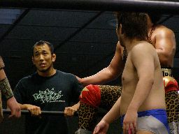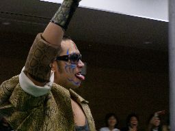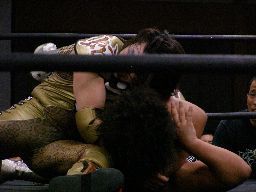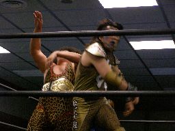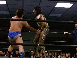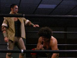 魔蛇美ロープに振る、坂井切り返してすくい投げ、魔蛇美ブロックしてコブラクロー(右写真)。晴也「やめなさい、コラ!」ディーノ「いつもそんなんだっけ?」晴也「普段はこんなもん。」ディーノ「ならいいけど。」魔蛇美坂井を場外に出す。ポイズンが客席に投げ込んでイス攻撃、リングに戻す。坂井がディーノにタッチしようとするがディーノ無視。坂井「なんで無視すんだよ!」5分経過。