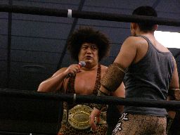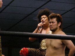 坂井はマイクを持ったまま魔蛇美の技を受け続ける(右写真)。が、マイクを返して魔蛇美と場外に。
