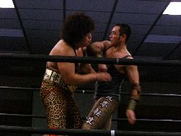 ディーノナイトメア(左写真)、魔蛇美がパンチ、ディーノ座りこむ。カウントは2。