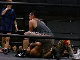 坂井がバイオニックエルボー、ディーノが男色ドライバー(右写真)、坂井がカバー、カウント2。