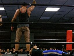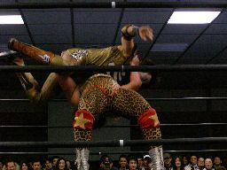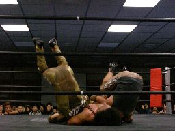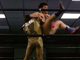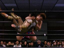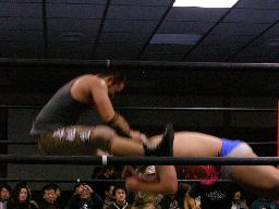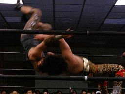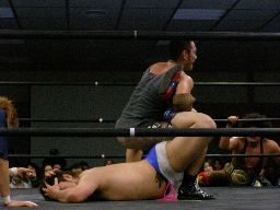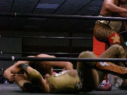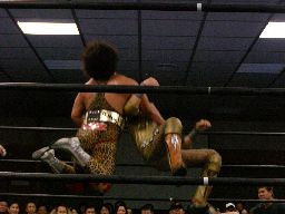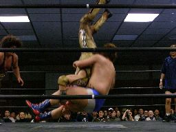 坂井がマッスルロック、ポイズンはマムシバイスに切り返す、ディーノがカット。ポイズンバックドロップ(右写真)。