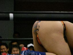 ポイズン再度チョークスラムの体勢、ディーノブロックして股間をつかむと(右写真)男色スクリュー、坂井にタッチ。
