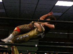 ディーノをロープに振ってダブルのフラップジャック(右写真)、魔蛇美がカバー、カウント2。