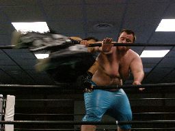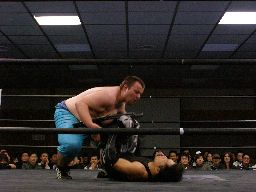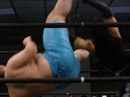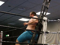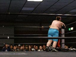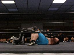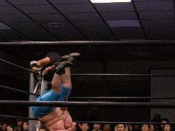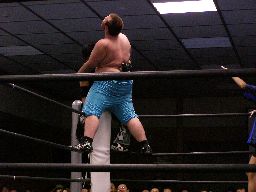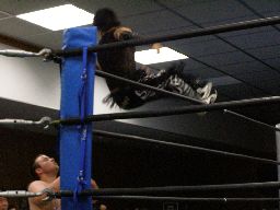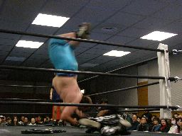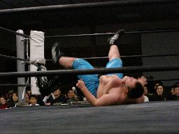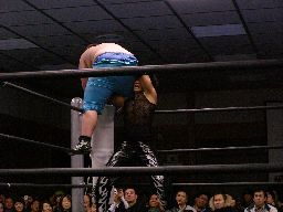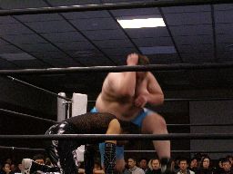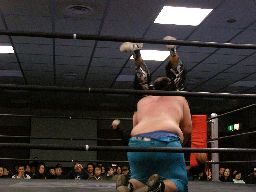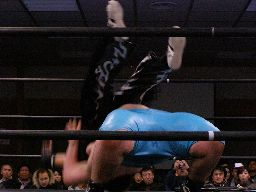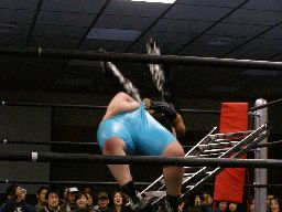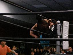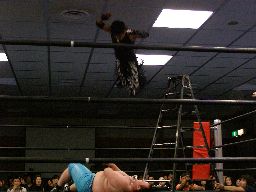 MIKAMI後ろ向きにコーナーに上る、そして最近出してなかったスーサイドボム(左写真じゃなんの技かわかりませんね)、3カウント。