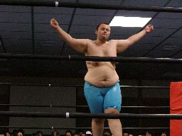 しかしアメバルは別方向のロープに飛んでもう一発フライングソーセージ、そしてオッパイ固め(左写真)、カウント2。