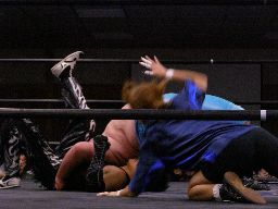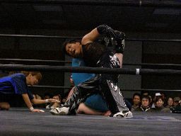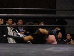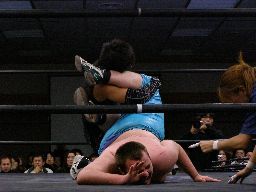 アメバルラリアット、MIKAMIは下に潜り込んで前方からスクールボーイのような形で両足をたたんで体重を掛ける(右写真)。これが予告していた「しゃちほこ式スク〜ルボ〜イ」か。アメバルロープ。