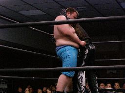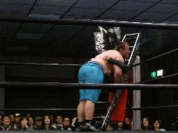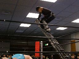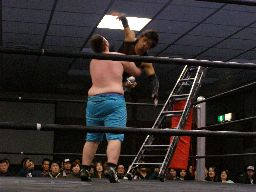 アメバルはラダーを斜めにセット、その上にMIKAMIをブレーンバスターで投げようとする。MIKAMIは必死にブロック。アメバル持ち上げる、MIKAMI背後に着地する、アメバル向き直ってもう一度持ち上げると旋回してMIKAMIをラダーに叩きつける(右写真)。
