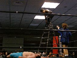 リングに戻りMIKAMIはラダーを立てると頂上に上るが、天井が低いためヴォルカニック・ボムのような技には行けず。