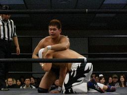 パンDo「行くぞブレーンバスター!」と予告して首固めに(右写真)、カウント2。サイドスープレックスからカバー、カウント2。矢郷にタッチ。