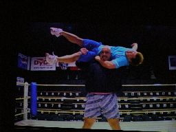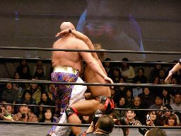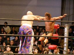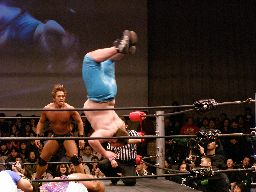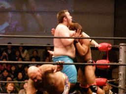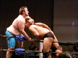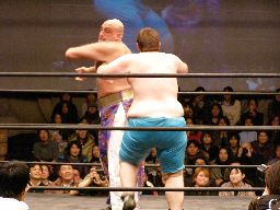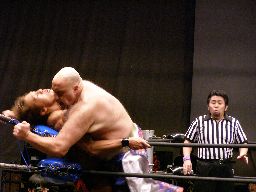 再度ロックアップ、星誕期ヘッドロック、アメバルロープに振る、ショルダーブロックの打ち合い(左写真)。星誕期はぶちかましでアメバルを吹っ飛ばす。両軍タッチ。
