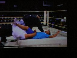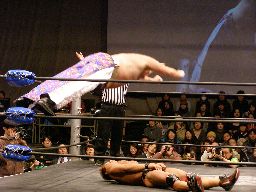 パンチで倒すとセカンドコーナーに上って垂直落下式ダイビングボディプレス(右写真)、アメバルがカット。