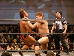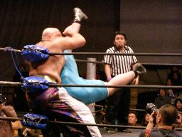 マイケルと星誕期がリングイン、チョップの打ち合いからマイケル急所打ち(左写真)。