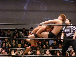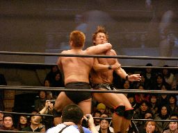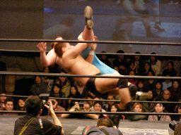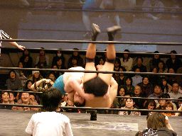柿本がバック取る、星誕期ロープに飛んでフェースクラッシャー→チョークスラム+ジャーマン(右写真)。
