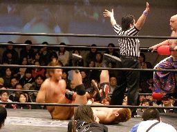 ヘンタイスライドの終着点はアメバルのオッパイ(左写真)。マイケルがカバー、カウント2。5分経過。