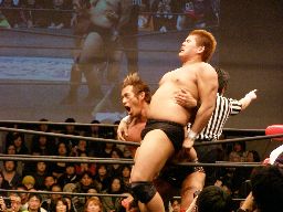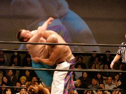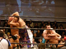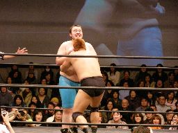他の相撲出身レスラーのデビュー戦に比べても、ロープワークもちゃんとしてたし、何より力が凄い。年齢的なものがあるから爆発的に伸びることはないだろうけど結構期待できるかも。レギュラー参戦するのかな?