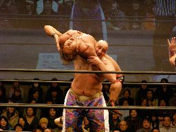 星誕期はカナディアンバックブリーカーで担ぎ上げて(右写真)、