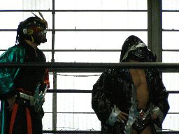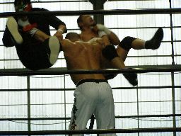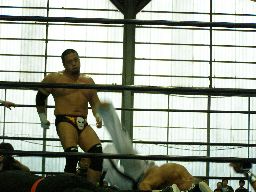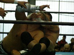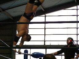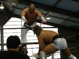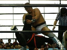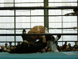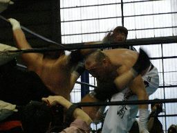 人生がサスケを振ってGAINAがラリアット(右写真)、カウント2。GAINAもう一発ラリアット、サスケかわす、東郷がGAINAにカウンターのラリアット。