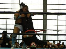 人生が入ってサスケに逆片エビ(右写真)、サスケロープ。GAINA入ってダブルのレッグブリーカー。GAINAエルボースマッシュ2発、ボディスラムからコーナーに上ってダイビングエルボードロップ、サスケかわして東郷にタッチ。