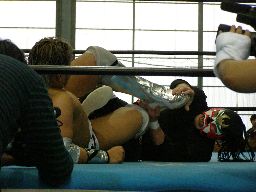 サスケがボディスラム、東郷がエプロンからシルバーブレット(左写真)。