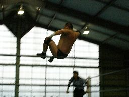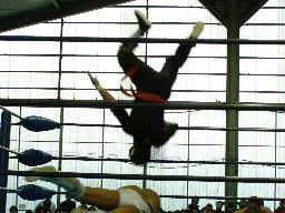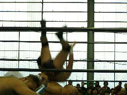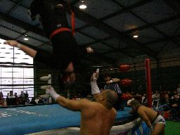 サスケが人生にドロップキック、自ら場外転落。東郷はこのスキにダイビングセントーン(右写真)、人生は難なくサスケを振り切ってカット。15分経過。