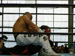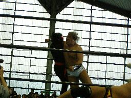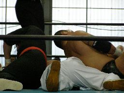 東郷がペディグリー狙う、GAINAブロック。GAINA至近距離からのラリアット、東郷かわしてクロスフェースに御(右写真)。