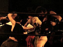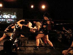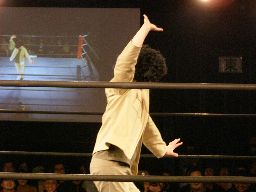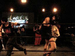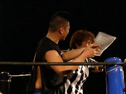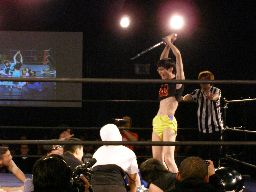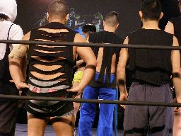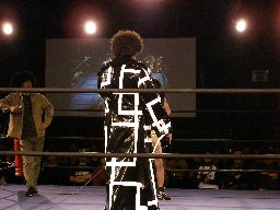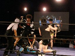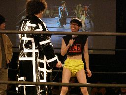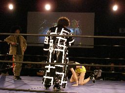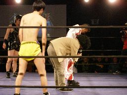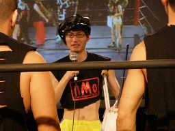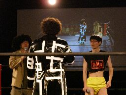 ペドロ、趙雲、子川、HG、マジック、ニラがnMoのTシャツを着てリングに。みなトーナメントは辞退したらしい。それぞれの武器やら何やらを藤岡に渡す。ニラは「思いっ切り悪いことやってくれ」と青の竹刀を。マジックは「マジックは基本的に人を騙す商売です。」とマジック道具を。趙雲は「この刀、中国製の割りによく切れるよ。」と刀を。子川は「怪我した振りして相手を撹乱するのは効果的だ。」と松葉杖を。ペドロは「ケガする前に保険に入ってよ」と書類を。HGは「ハードゲイの振りをしたら嫌われるかもよ」と帽子を渡す。「あとmixiはもっと活用した方がいい。」藤岡「あばれブラックHGさん!」