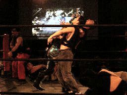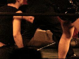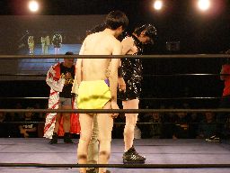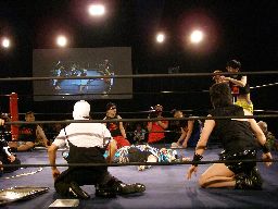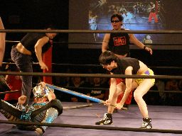 虎龍鬼の入場時にnMoが襲い掛かる。リングに上げると藤岡が竹刀攻撃(左写真)。