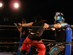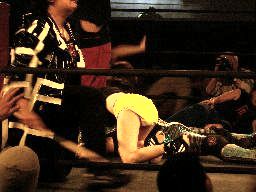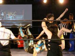 虎龍鬼を対角線に振る、藤岡フライングネックブリーカードロップ(右写真)、カバー、虎龍鬼は2で返す。