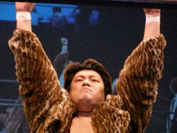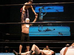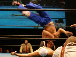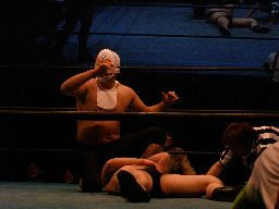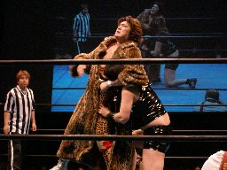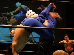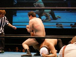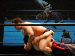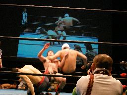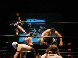 コーナーに振って浴びせ蹴り、アントンにタッチ。アントンキック連打(右写真)、サードロープに足を引っ掛けるとヒップドロップ、坂井にタッチ。