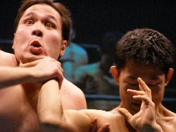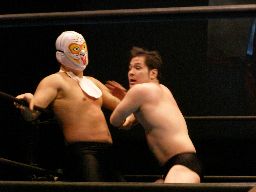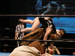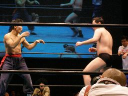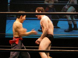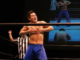 趙雲ロープに振る、アントンショルダーブロックで返す。アントンロープに飛ぶ、趙雲ソバット、エルボー(右写真)。