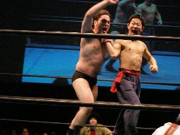 対角線上のコーナーに立った酒井と趙雲がサンドイッチミサイルキック(左写真)。