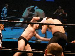 禁断のサカイ対決(右写真)。当然会場からは「サカイがんばれ」コール。