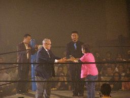 休憩明け、「ベビーフェースに転向した大鷲が本日の収益の一部を福祉のために市に寄付」ということで今大会のプロモーターでもある大鷲母から佐久市長に目録が贈呈される(右写真)。