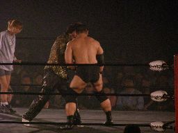8番目の入場、ビジョンには「SECRET」の文字。入場テーマは「宇宙戦艦ヤマト」。大柳錦也がマジックハンドを両手に持って入場。早速ダブルのクローズラインをかわしてマジックハンドラリアット。高木とは手四つに(右写真)。