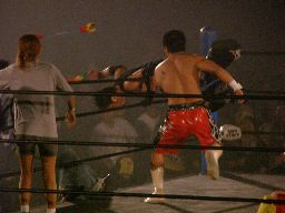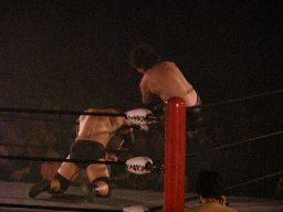 ロープワークからショルダーブロック合戦、THE MACがやはり優勢(左写真)。
