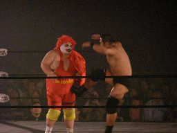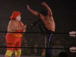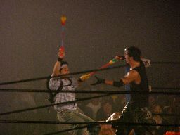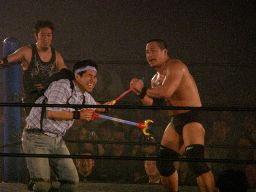 エアギターやってるうちに1分が過ぎ、5番目のHARASHIMAが入場(右写真)。しかしその向かう先のリングには誰もいない。HARASHIMA入場ランプまで戻りTHE MACを連れてリングに。