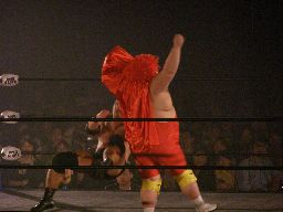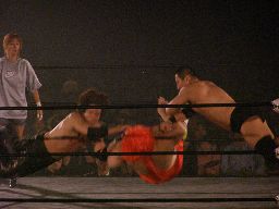 ディーノと福田はまだ場外。9番目の入場は高木“ジェット”省吾。スリーパーのトーテムポール状態(左写真)。