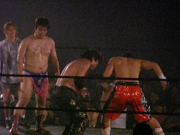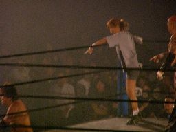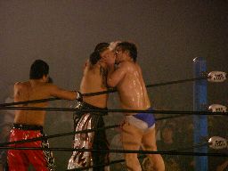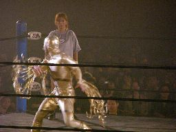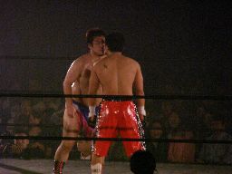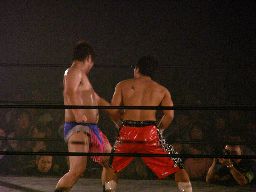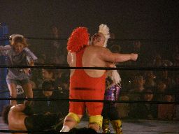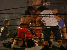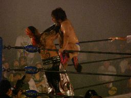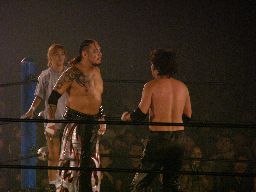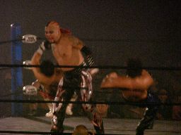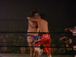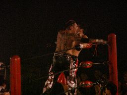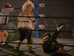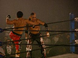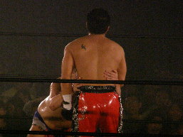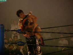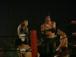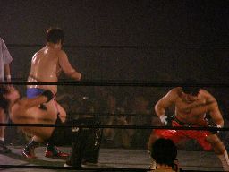 ジェットはTARUをトップロープ越しにエプロンに引きずり出しジェットパンチ(右写真)、TARU受け流す。