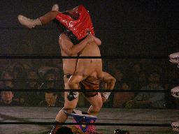 対角線コーナーに振る、ジェット切り返して突っ込む、TARUはショルダースルー、ジェットはトップロープを越える(左写真)がエプロンに着地。