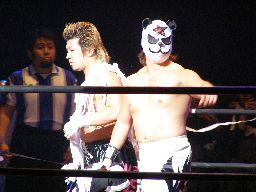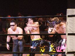 KUDOがパンDoを羽交い絞めして高木がケンカキック、パンDoかわしてKUDOに誤爆(右写真)。パンDoはSHIGERUにタッチ。