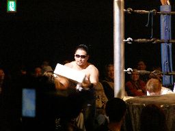 チーム2サウザンアイランドが先制攻撃、2人を場外に落とす。スポンサーからSHIGERUにスポーツドリンクが贈呈、ということでリング上に箱が積んであったのだが、高木はそれを使ってSHIGERUに攻撃(右写真)。