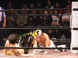 この試合は「撮影禁止」の指示があったので写真なしで。先発はSKBと忍。最初は普通にレスリングしていたが、SKBがバッグからフォークを取り出すと忍の尻にグサグサ突き刺す。忍は尻から流血、ピンクのタイツが赤く染まる。実況のテイオーも言ってたが、あんまり普段見ない箇所からの流血は引くなあ。しかし実況陣、「下血」はねえだろ。SKBは666を呼び込んでダブルのアトミックドロップを3連発。忍は尻を押さえて悶絶。SKBは卒塔婆で忍の尻を打ち据える。須山「バカ社長は寺の息子なんですけどねえ。」そうだったのか!SKBは666にタッチ。ロープワークから忍がドロップキック、なんとか宮本にタッチ。宮本666にエルボー、ラリアット。カバーはカウント2。666もラリアット返す。SKBは忍を捕まえ会場中を引き回す。666チョークスラム、コーナーに振ってクロスチョップ。666ボディスラム、コーナーに上ってスワントーンボム、カウント2。666バックドロップ、宮本回転して着地、トラースキック。5分経過。