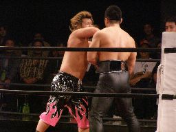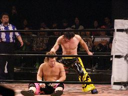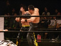高木ケンカキック、SHIGERUかわしてフィッシャーマンズバスター(左写真)、パンDoにタッチ。高木もKUDOにタッチ。