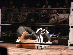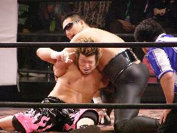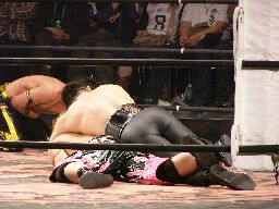 パンDo高木にショルダーブロック、ランニングエルボー、カウント2。パンDoブレーンバスター狙う、高木ブロック、パンDoは首固めに(右写真)、カウント2。パンDo立ち上がるとすぐにシャイニングウィザード。
