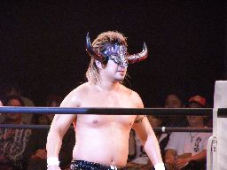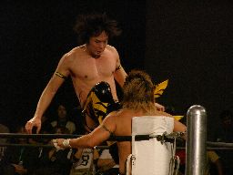KUDOはSHIGERUをコーナーに詰めるとモンゴリアンチョップ。首投げから手刀落とす(右写真)。そしてサッカーボールキック。SHIGERU立ち上がってエルボー、KUDOはヒザ蹴りで倒しストンピング、高木にタッチ。