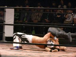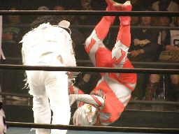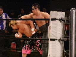 パンDoがKUDOにラリアット。SHIGERUにタッチ。SHIGERUはKUDOをコーナーに上げると雪崩式フランケン(右写真)、カウント2。