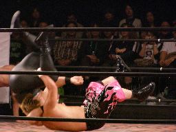 宮本コーナーに上ってフロッグスプラッシュ、666かわしてラリアット。666ロープに振る、宮本ハンドスプリングエルボーかと思ったらそのままショーンキャプチャー、そしてアンクルホールドに。666ロープ。宮本コーナーに振って串刺しエルボーからノーザンライトスープレックス、カウント2。忍がタッチ要求、宮本応じる。忍コーナーに上るが「ケツに力が入らない!」と叫ぶと足踏み外す。666エルボー、DDT、SKBにタッチ。忍の尻を卒塔婆で乱打。666にタッチ。666はヘッドバット乱打からロックボトム。SKBが腕にサポーターをつける。SKB光り輝く腕でラリアット、しかしカバーは宮本がカット。宮本はSKBを場外に連れ出す。666は忍をコーナーに振って串刺しエルボー。尻を鷲づかみにして変形パンプハンドルスラム、カウント2。666コーナーに上る、忍も上って雪崩式ブレーンバスター狙う、666ブロック。666リングに降りてロープに飛ぶ、宮本がカウンターのニールキック、そして忍がS.E.X.、カウント3。