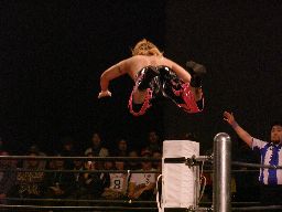 続いてKUDOも花道を走り、トップロープに飛び乗るとスワンダイブミサイルキック(左写真)。これは凄い。