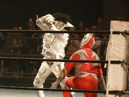 Liteはロビンをコーナーに詰めてドリル攻撃、ロビンかわす(右写真)。